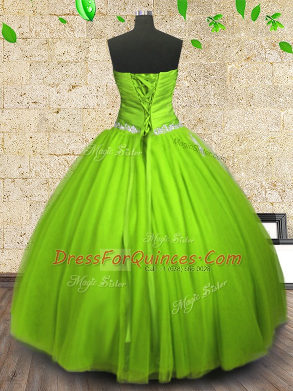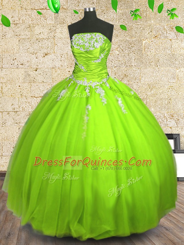 Amazing Ball Gowns Tulle Strapless Sleeveless Appliques and Ruching Floor Length Zipper 15 Quinceanera Dress