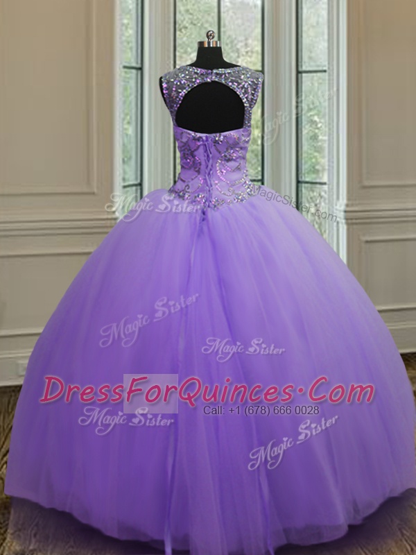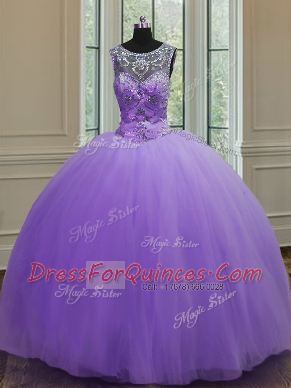 Amazing Scoop Floor Length Lavender 15 Quinceanera Dress Tulle Sleeveless Beading