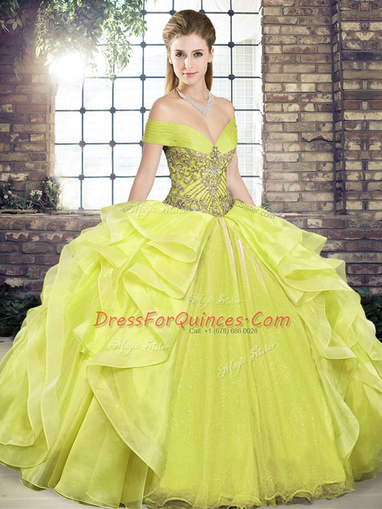 Beading and Ruffles 15 Quinceanera Dress Yellow Lace Up Sleeveless Floor Length