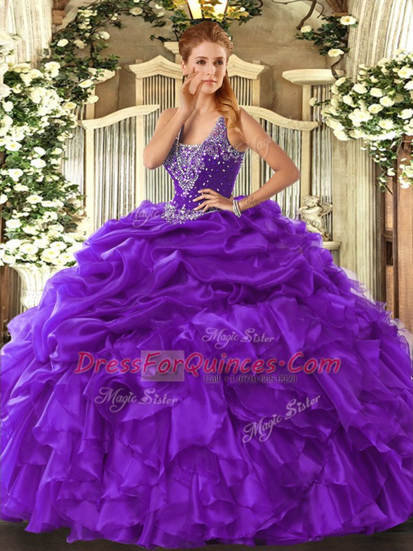 Beauteous Sleeveless Organza Floor Length Lace Up Sweet 16 Dress in Purple with Beading and Ruffles and Pick Ups