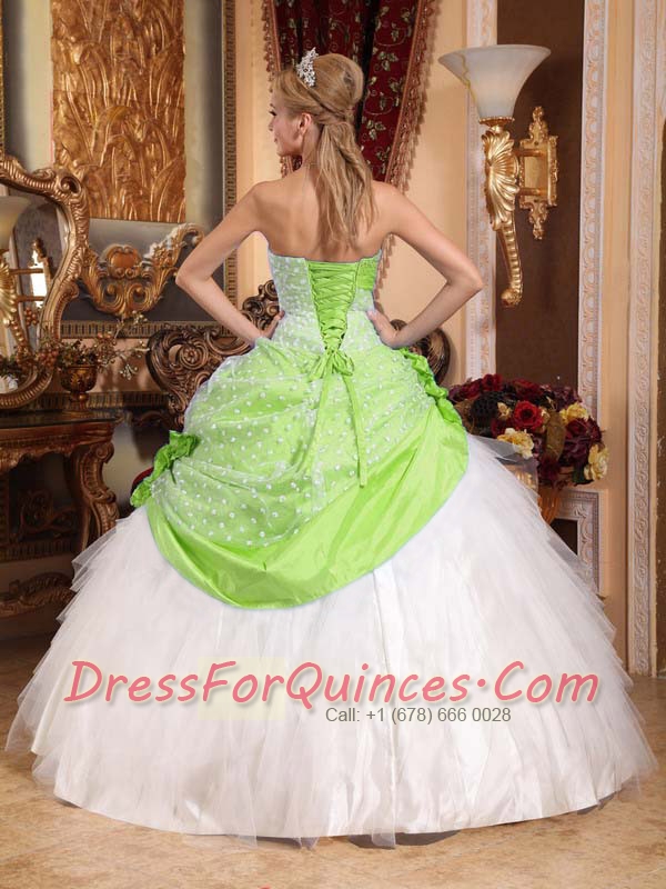 Beautiful Ball Gown Strapless Quinceanera Dress with Taffeta and Tulle Hand Made Flowers