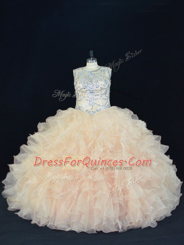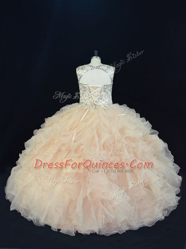 Champagne Lace Up Scoop Beading and Ruffles Quince Ball Gowns Organza Sleeveless