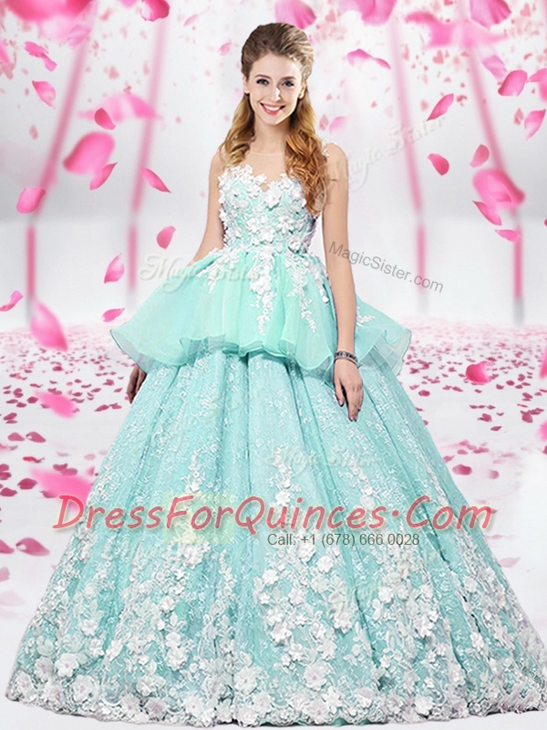 Clearance Scoop Sleeveless Quinceanera Dress Floor Length Lace and Appliques Apple Green Organza and Tulle