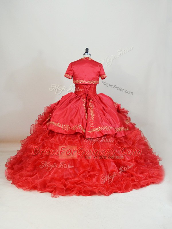 Comfortable Red Sweetheart Neckline Embroidery and Ruffles Quinceanera Gowns Sleeveless Lace Up