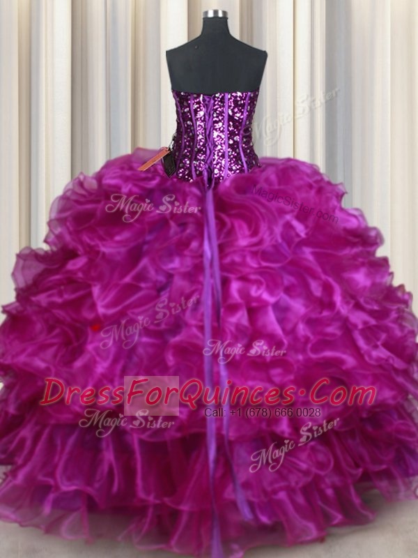 Custom Design Floor Length Lace Up Sweet 16 Dress Purple for Military Ball and Sweet 16 and Quinceanera with Beading and Ruffles and Sequins