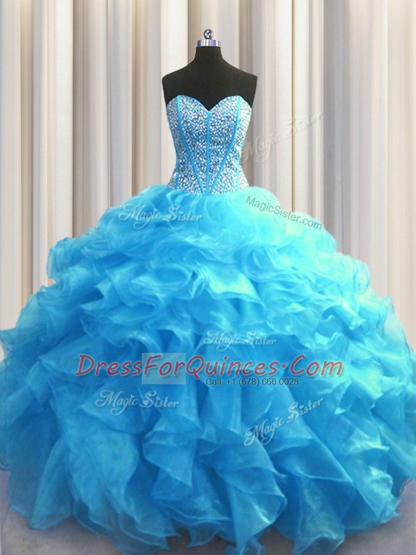 Dramatic Visible Boning Baby Blue Sleeveless Organza Lace Up Quinceanera Gown for Military Ball and Sweet 16 and Quinceanera