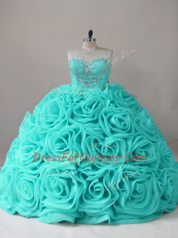 Extravagant Sleeveless Fabric With Rolling Flowers Lace Up Quince Ball Gowns in Aqua Blue with Beading