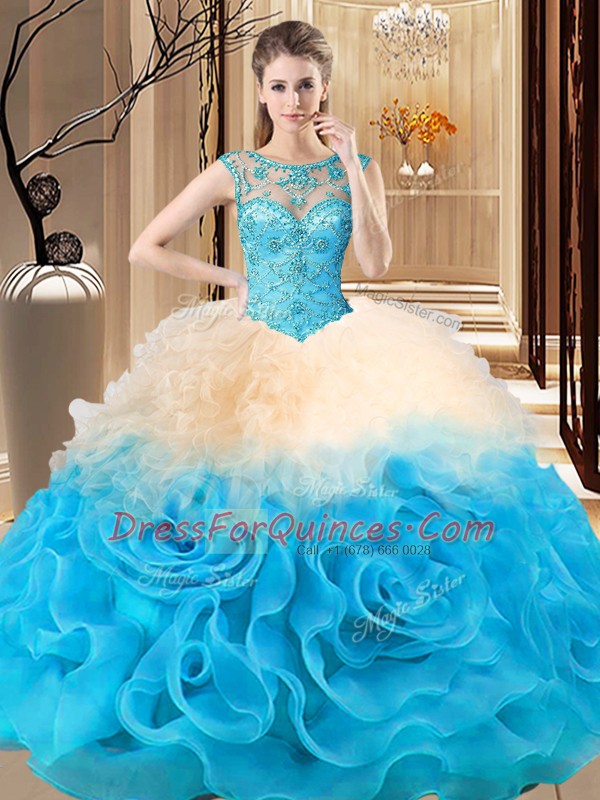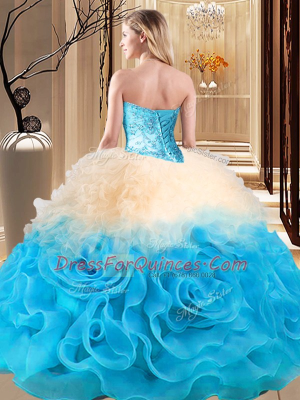 Fabric With Rolling Flowers Sleeveless Floor Length 15 Quinceanera Dress and Beading and Ruffles