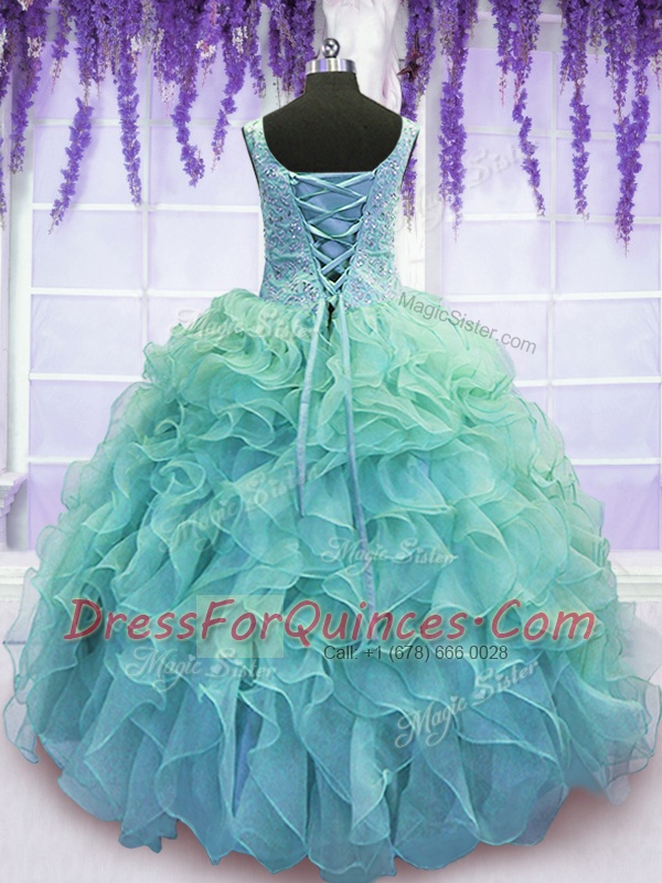 Fantastic Floor Length Lace Up Quinceanera Dresses Blue for Military Ball and Sweet 16 and Quinceanera with Beading and Embroidery and Ruffles