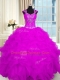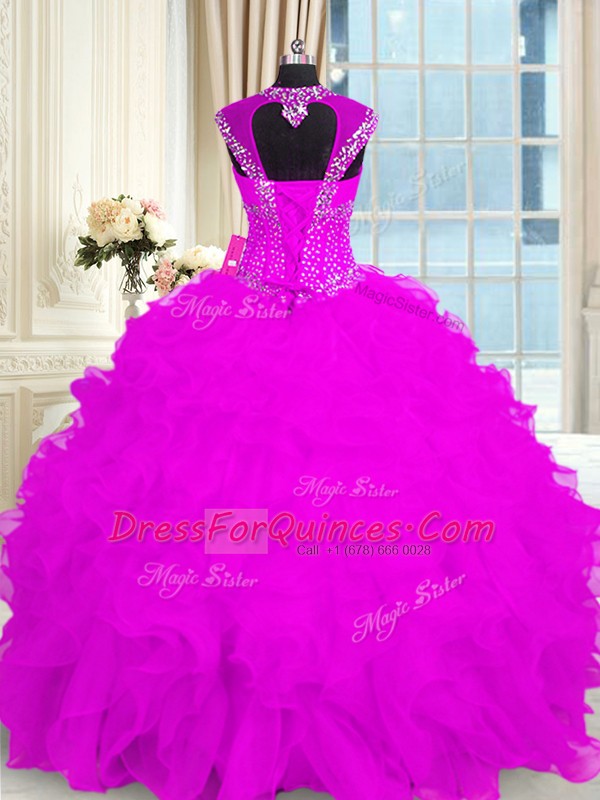 Fantastic Fuchsia Ball Gowns Beading and Ruffles Ball Gown Prom Dress Lace Up Organza Cap Sleeves Floor Length