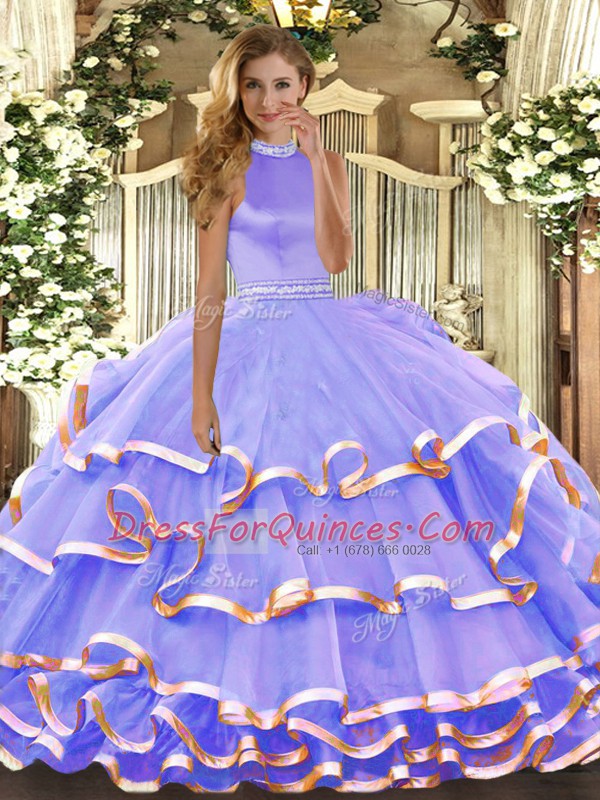 Flare Floor Length Backless 15 Quinceanera Dress Lavender for Military Ball and Sweet 16 and Quinceanera with Beading and Ruffled Layers