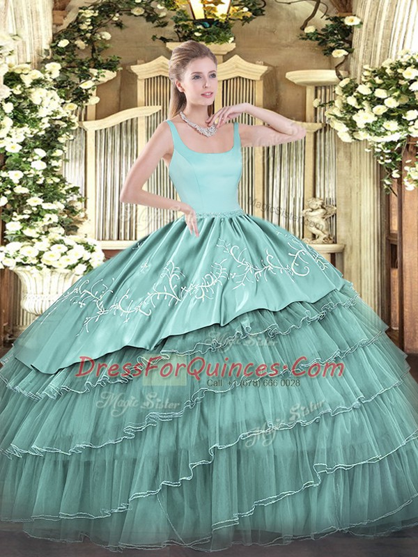 Great Sleeveless Organza Floor Length Zipper Quinceanera Gowns in Blue with Embroidery and Ruffled Layers