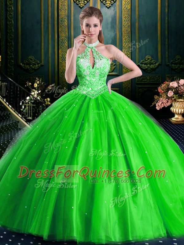 Halter Top Sleeveless Tulle Ball Gown Prom Dress Beading Lace Up