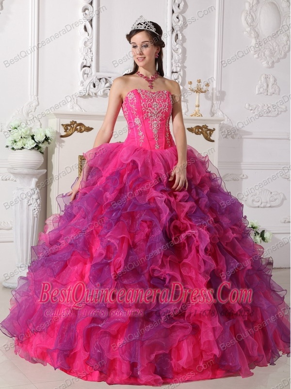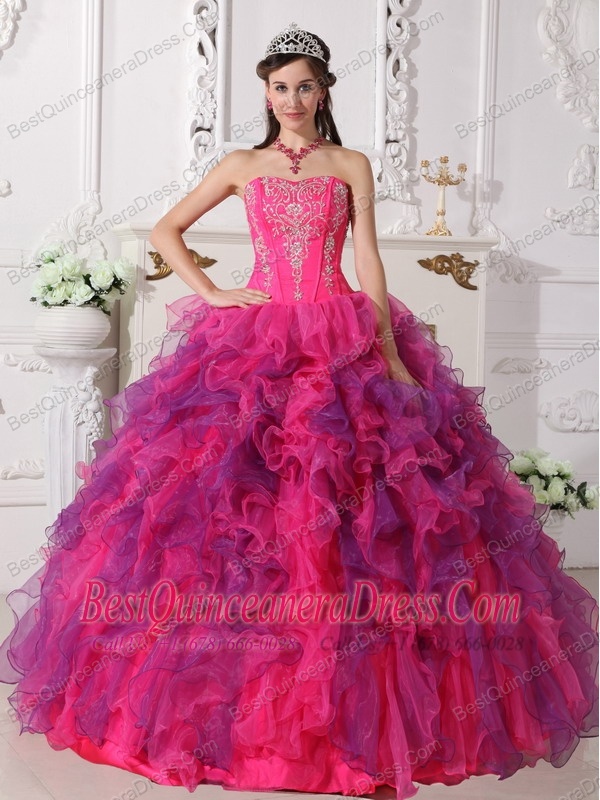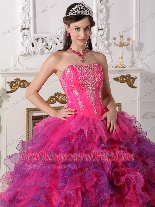 Hot Pink and Purple Ball Gown Sweetheart Floor-length Satin and Organza Embroidery Quinceanera Dress
