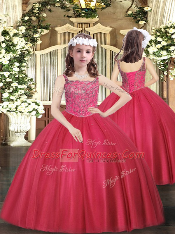 Hot Pink Ball Gowns Straps Sleeveless Tulle Floor Length Lace Up Beading Quinceanera Gowns