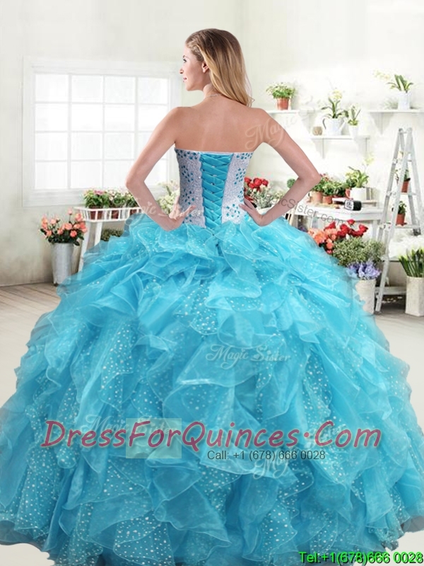 Inexpensive Beaded and Ruffled Turquoise Quinceanera Dress in Organza