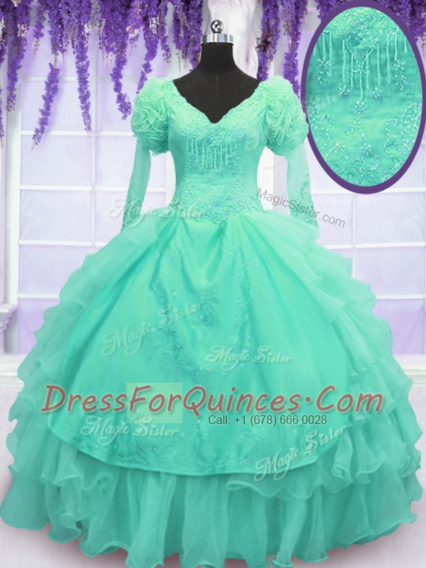 Long Sleeves Lace Up Floor Length Beading and Embroidery and Hand Made Flower Quince Ball Gowns