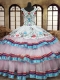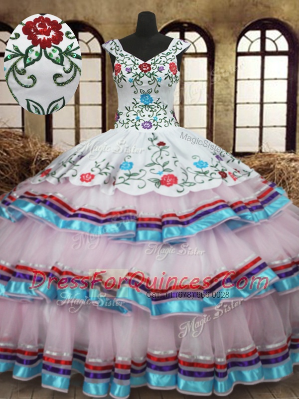 Low Price Straps White Sleeveless Embroidery and Ruffled Layers Floor Length Ball Gown Prom Dress