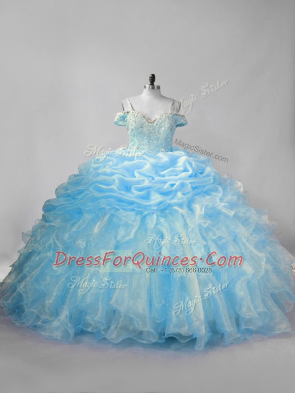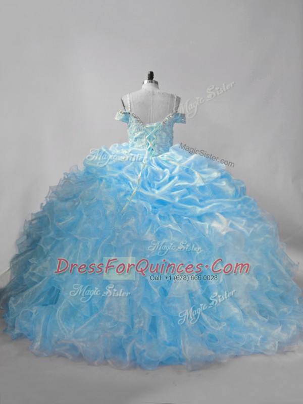 Modern Baby Blue 15 Quinceanera Dress Sweet 16 and Quinceanera with Beading and Ruffles and Pick Ups Straps Sleeveless Brush Train Lace Up