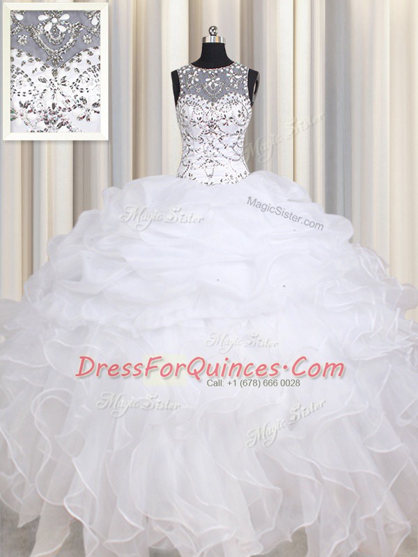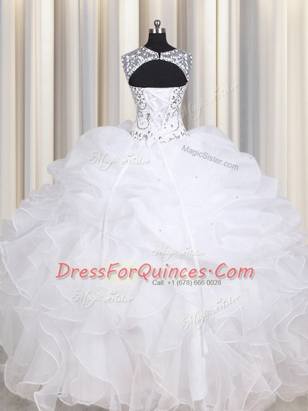Most Popular White Straps Lace Up Beading and Ruffles Quinceanera Dresses Sleeveless
