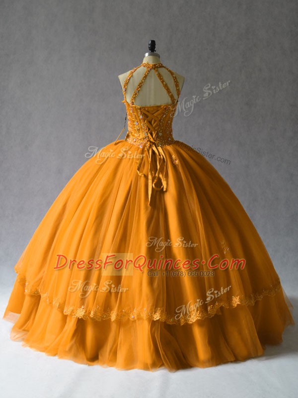 Orange Ball Gowns Halter Top Tulle Lace Up Beading Quinceanera Dress