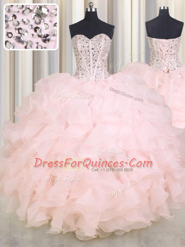 Organza Sweetheart Sleeveless Lace Up Beading and Ruffles Sweet 16 Dresses in Baby Pink