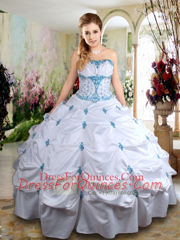 Perfect Taffeta White Quinceanera Dress with Appliques and Pick Ups