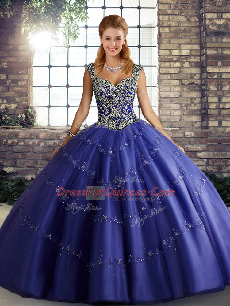 Purple Ball Gowns Straps Sleeveless Tulle Floor Length Lace Up Beading and Appliques Sweet 16 Dresses