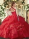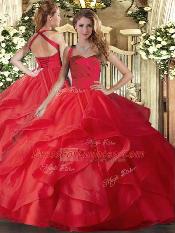 Red Quinceanera Dresses Military Ball and Sweet 16 and Quinceanera with Ruffles Halter Top Sleeveless Lace Up