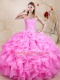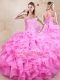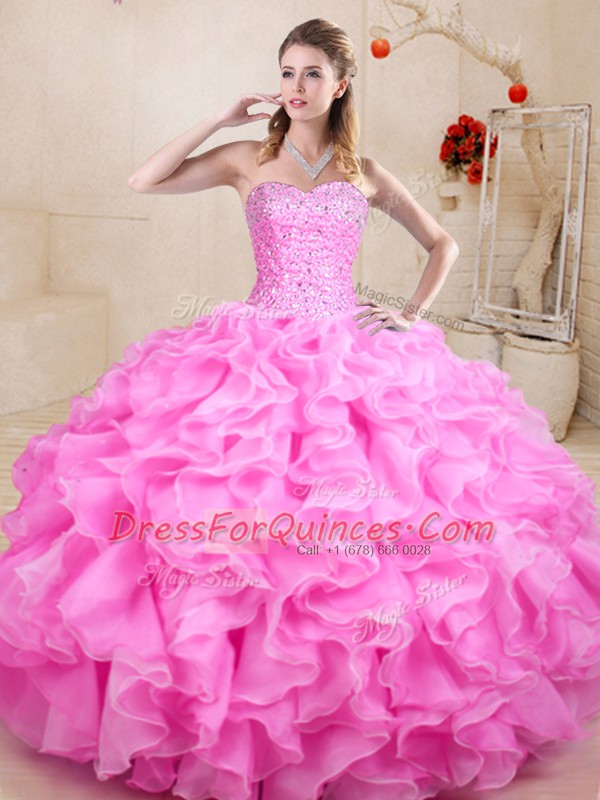Rose Pink Ball Gowns Beading and Ruffles 15 Quinceanera Dress Lace Up Organza Sleeveless Floor Length