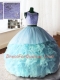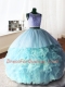 Scoop Sleeveless With Train Beading and Lace and Ruffles Zipper Quinceanera Dresses with Baby Blue Brush Train