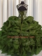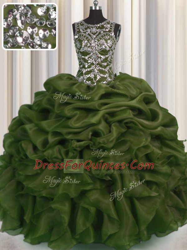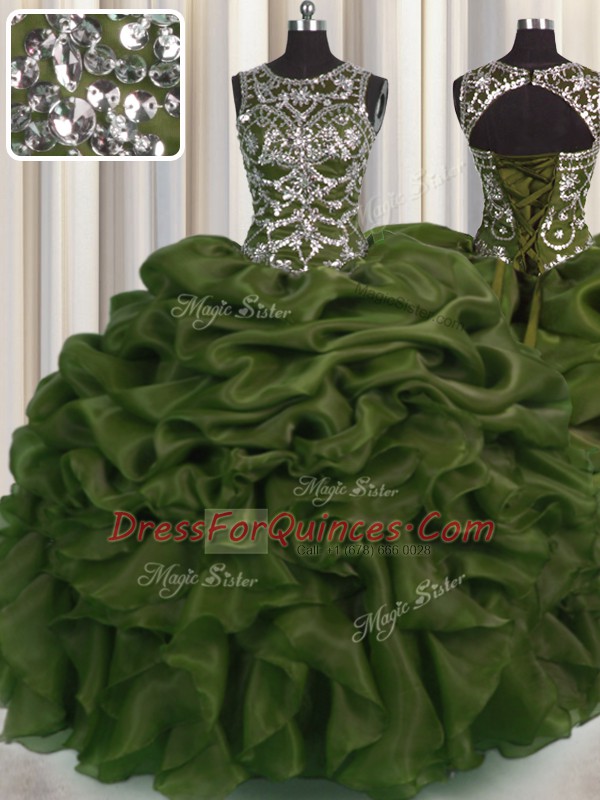 See Through Olive Green Ball Gowns Beading and Pick Ups Ball Gown Prom Dress Lace Up Organza Sleeveless Floor Length