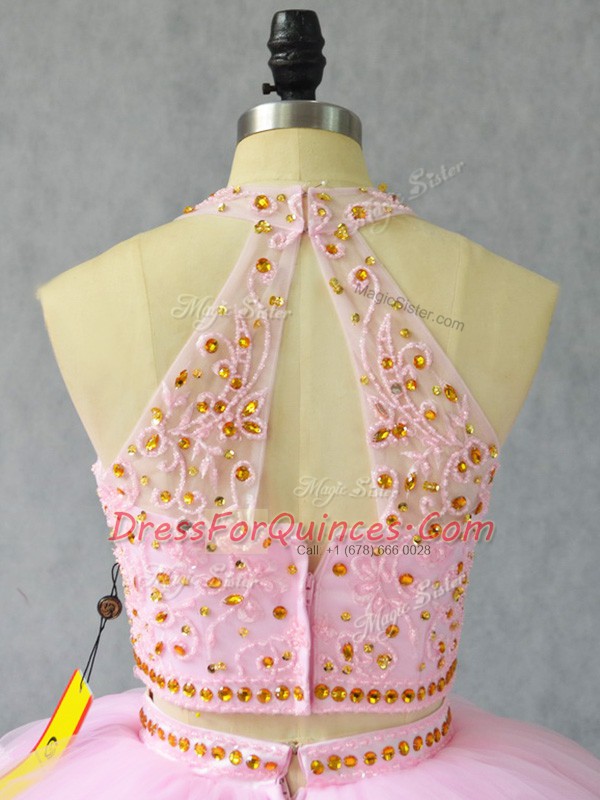 Sumptuous Halter Top Sleeveless Tulle Sweet 16 Dresses Beading and Appliques Court Train Zipper