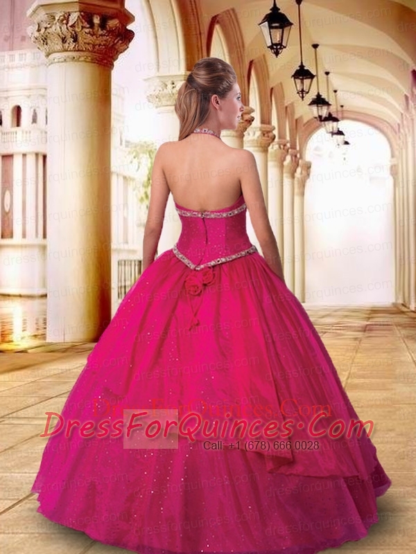 The Super Hot Halter Top Hot Pink Quinceanera Gown with Beading and Ruching