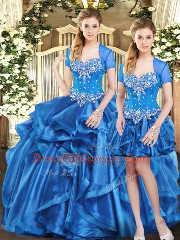 Trendy Floor Length Lace Up 15 Quinceanera Dress Blue for Military Ball and Sweet 16 and Quinceanera with Beading and Ruffles