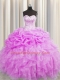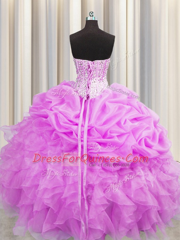 Unique Visible Boning Lilac Lace Up Sweet 16 Dresses Beading and Ruffles and Pick Ups Sleeveless Floor Length