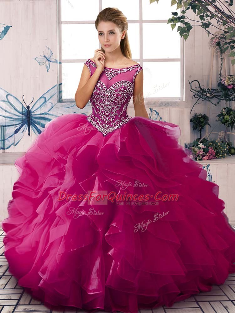 Vintage Sleeveless Floor Length Beading and Ruffles Zipper Quinceanera Dresses with Fuchsia