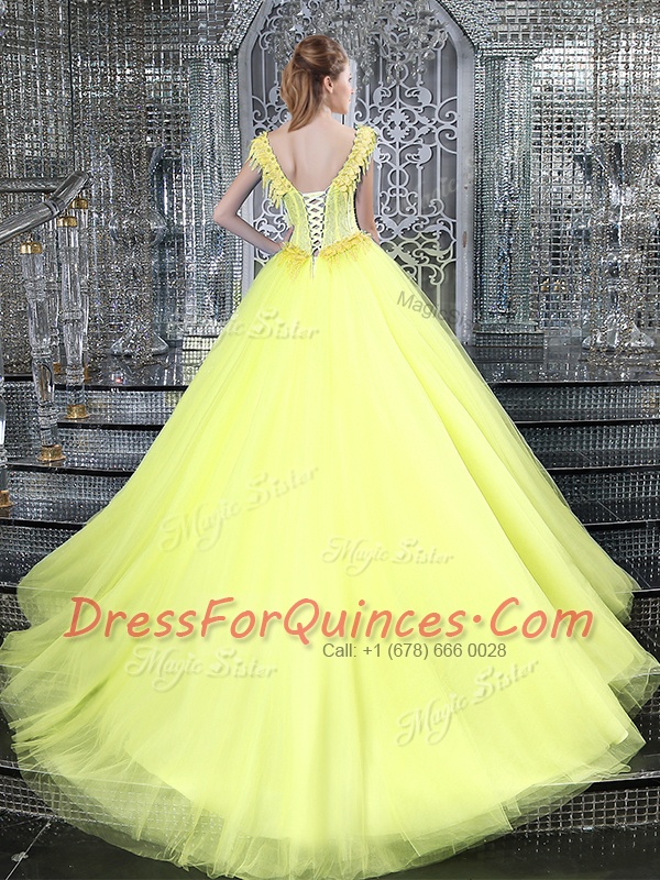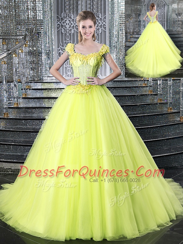 Charming Straps Sleeveless Brush Train Lace Up With Train Beading and Appliques Quinceanera Dresses