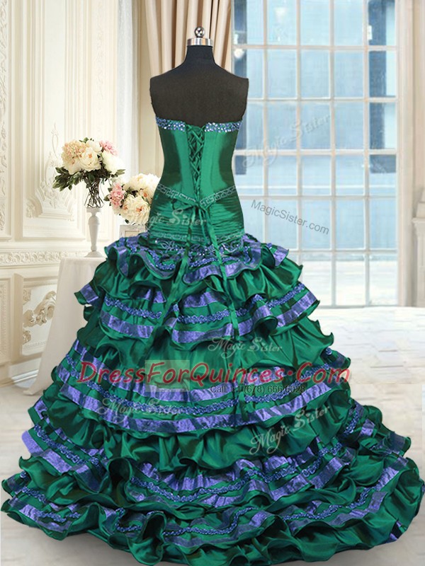Dark Green Sweetheart Neckline Appliques and Embroidery and Ruffled Layers and Bowknot Quinceanera Dress Sleeveless Lace Up