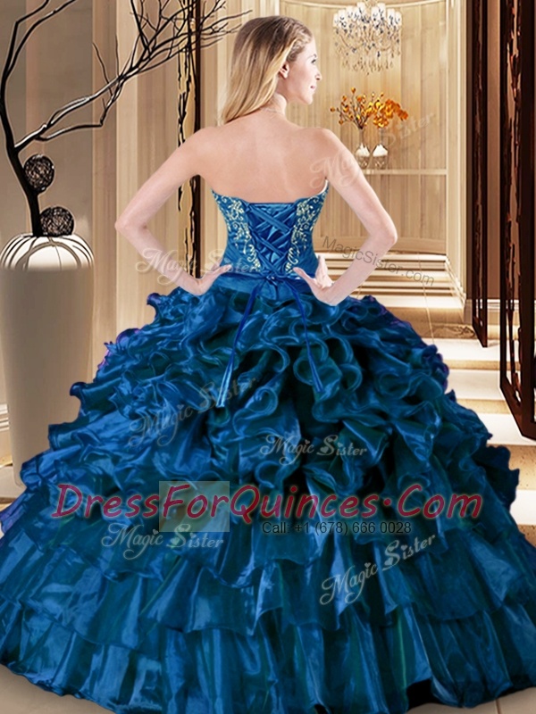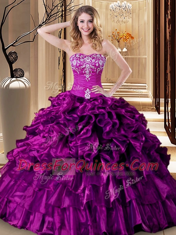 Dazzling Sweetheart Sleeveless Ball Gown Prom Dress Floor Length Embroidery and Ruffles Purple Organza