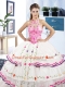 Halter Top Floor Length Lace Up Vestidos de Quinceanera White for Military Ball and Sweet 16 and Quinceanera with Embroidery and Ruffled Layers