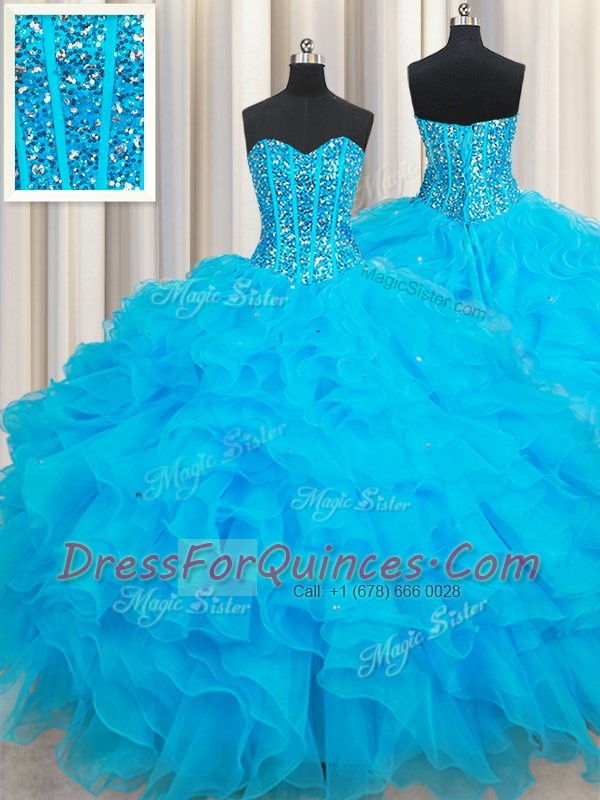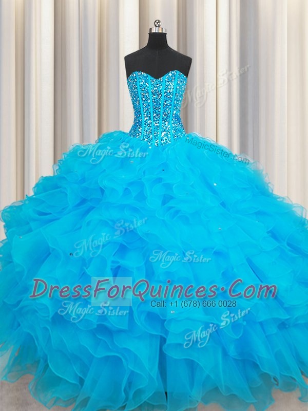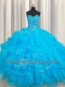 Hot Sale Floor Length Baby Blue Quinceanera Gown Organza Sleeveless Beading and Ruffles