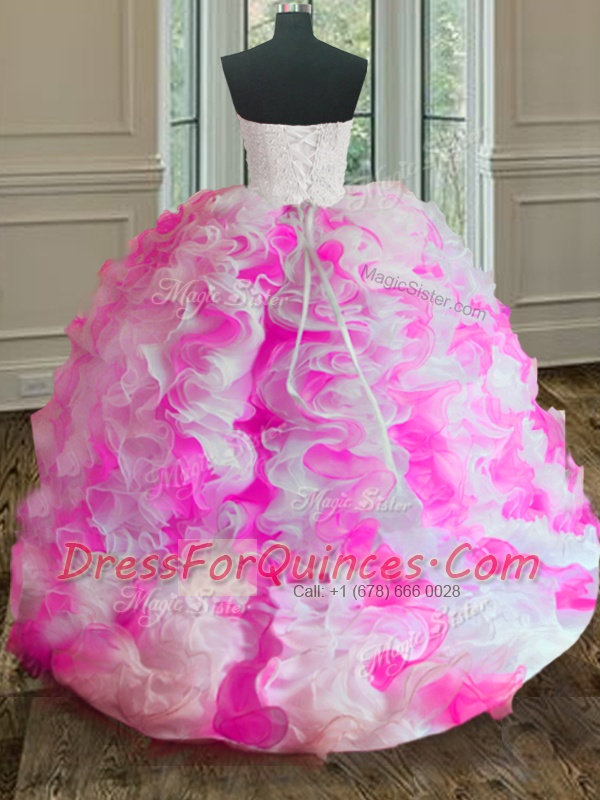 Modern Floor Length Pink And White Quinceanera Gown Organza Sleeveless Beading and Ruffles
