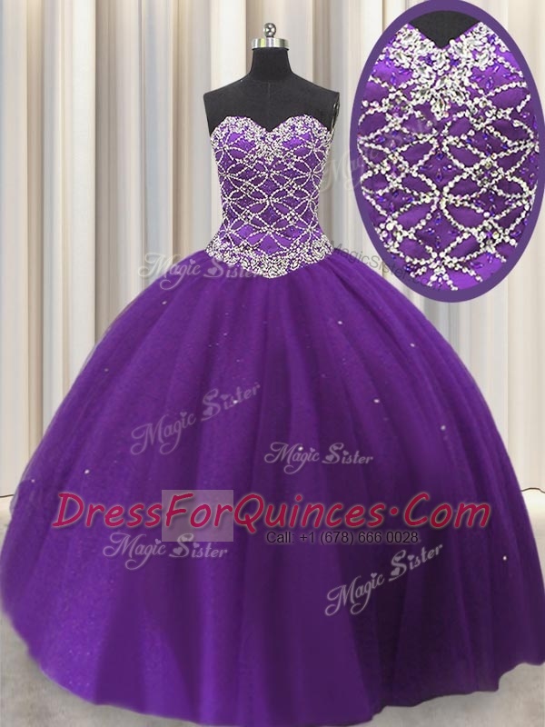 Romantic Eggplant Purple Sleeveless Floor Length Beading and Sequins Lace Up Quince Ball Gowns