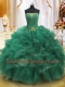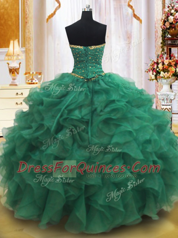 Sleeveless Organza Floor Length Lace Up Sweet 16 Dress in Dark Green with Beading and Ruffles