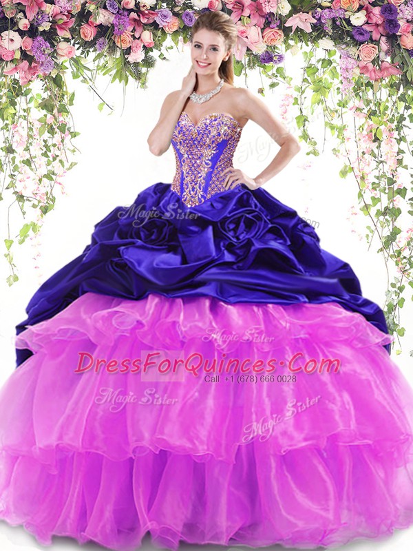 Sophisticated Sweetheart Sleeveless Organza and Taffeta 15 Quinceanera Dress Beading and Ruffled Layers and Pick Ups Brush Train Lace Up