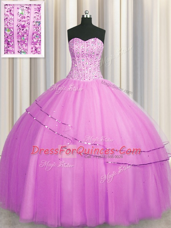 Sophisticated Visible Boning Really Puffy Floor Length Lace Up Vestidos de Quinceanera Lilac for Military Ball and Sweet 16 and Quinceanera with Beading