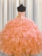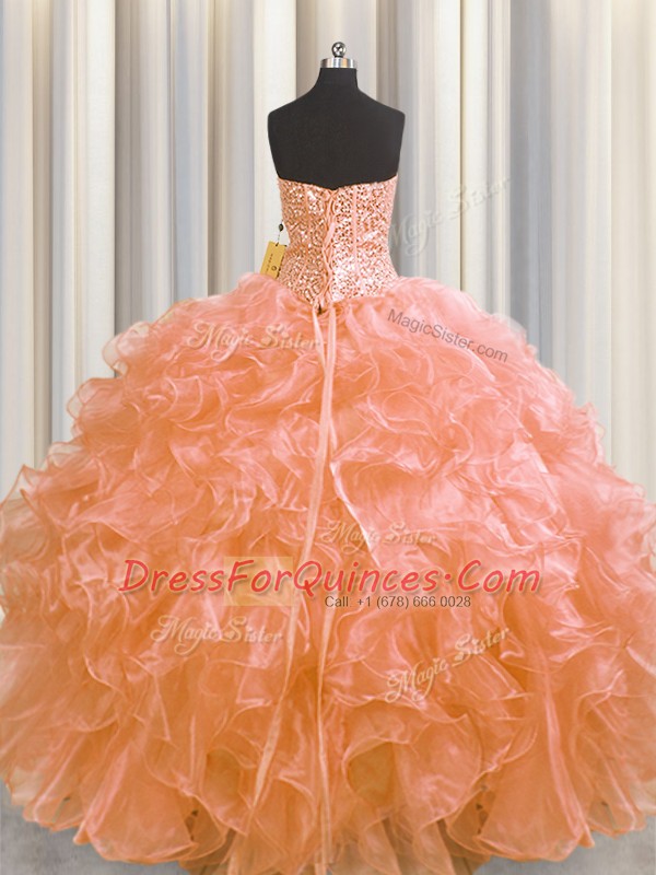 Visible Boning Orange Ball Gowns Beading and Ruffles 15th Birthday Dress Lace Up Organza Sleeveless Floor Length