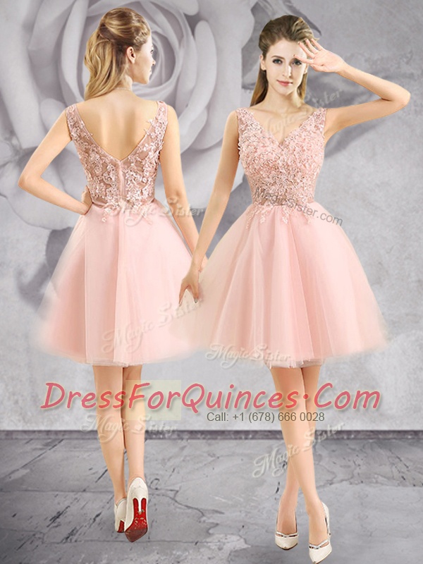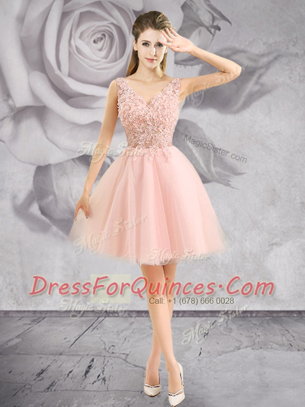 Baby Pink Zipper Dress for Prom Appliques Sleeveless Mini Length