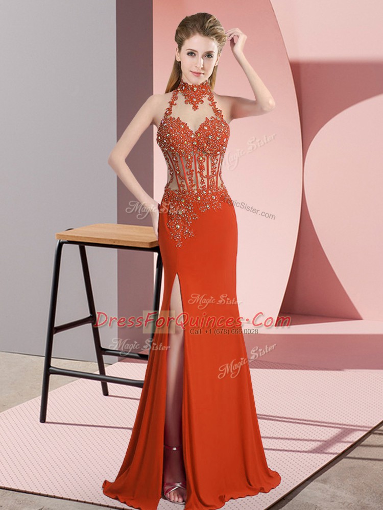 Best Selling Orange Red High-neck Backless Lace and Appliques Prom Dress Sleeveless